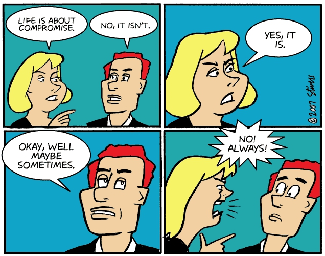 Me: “Dear, sweet, lovely woman…that’s not a compromise.  That’s you getting your way completely.  Isn’t there some other way that we can both be relatively happy?”